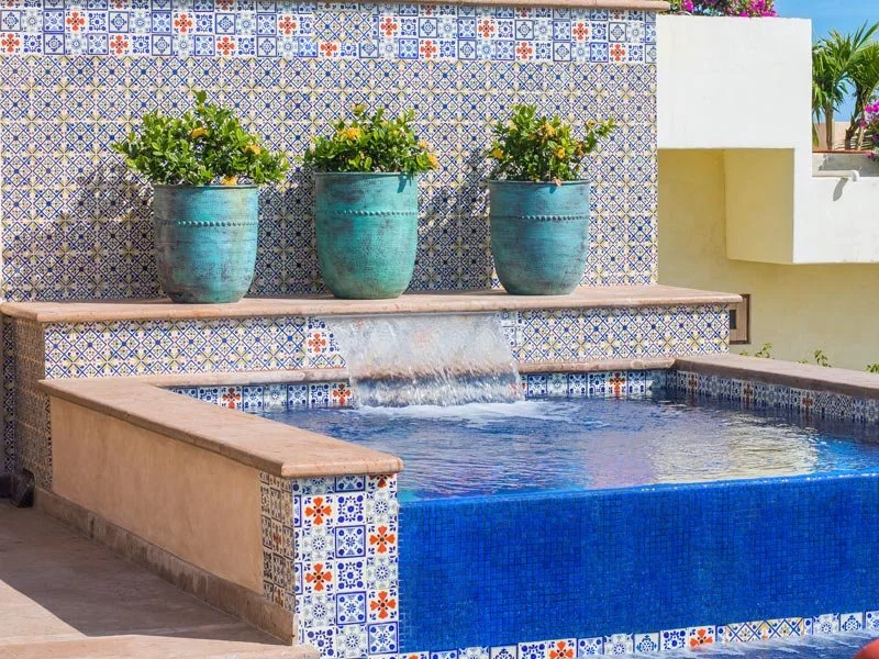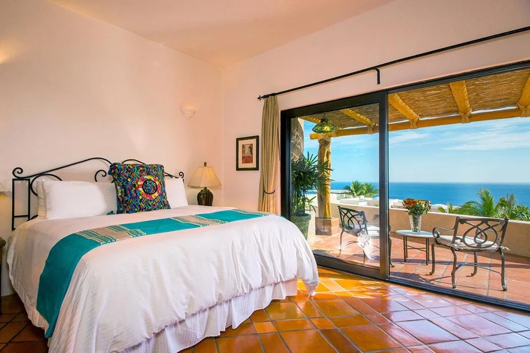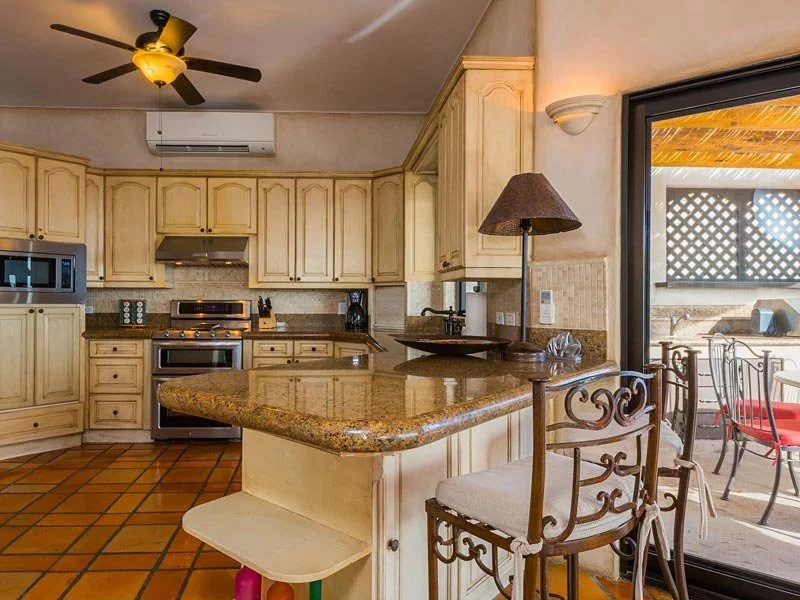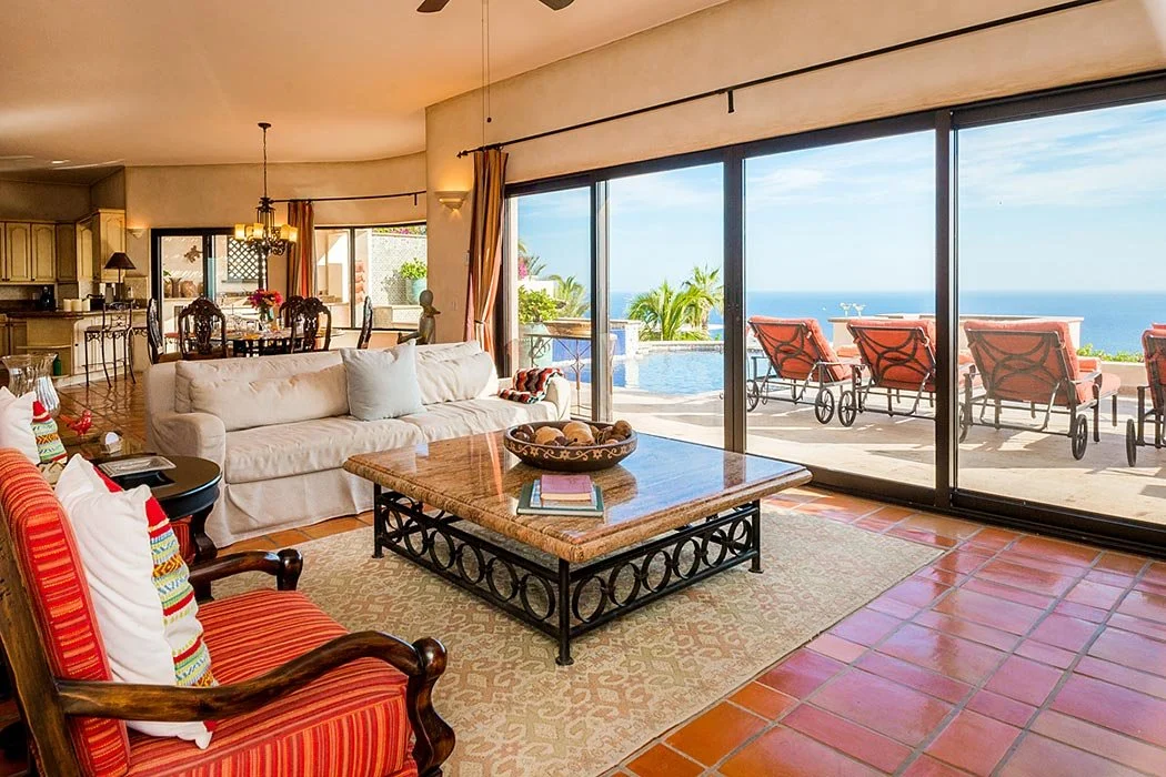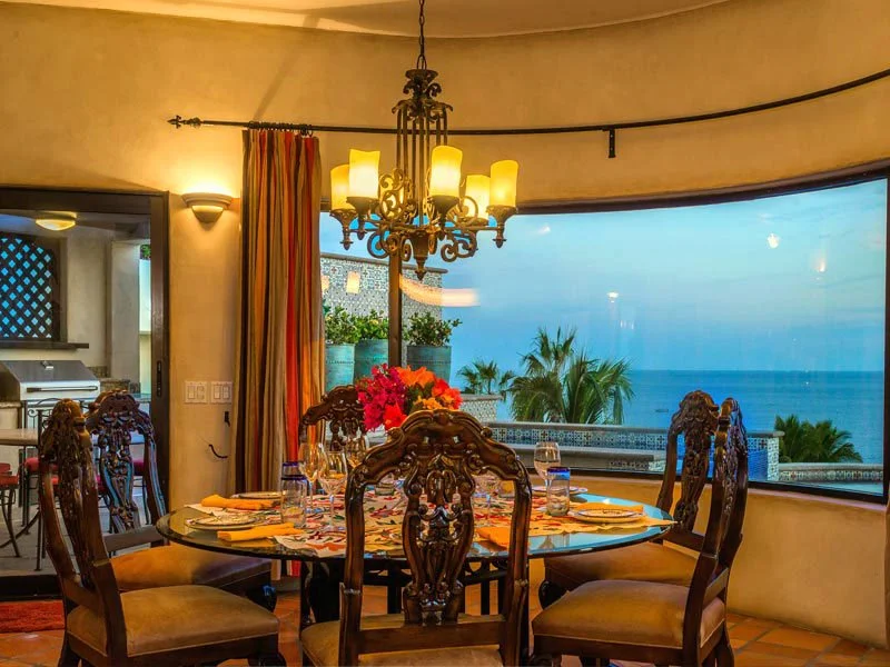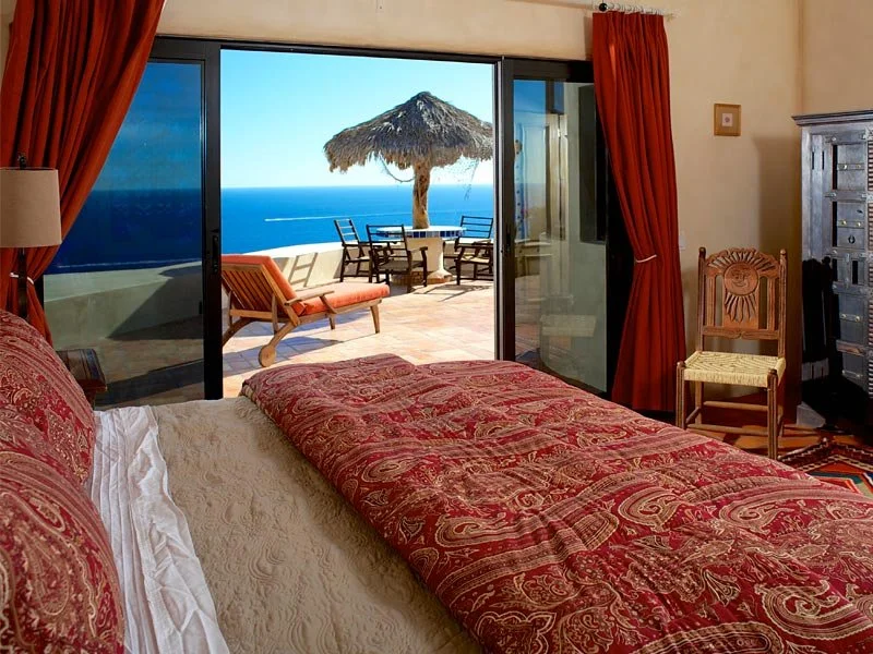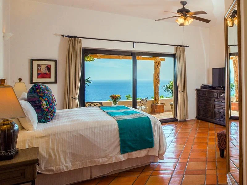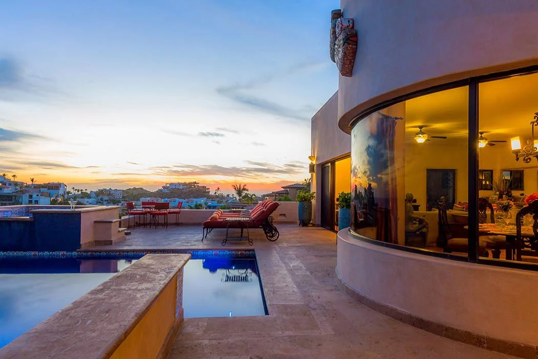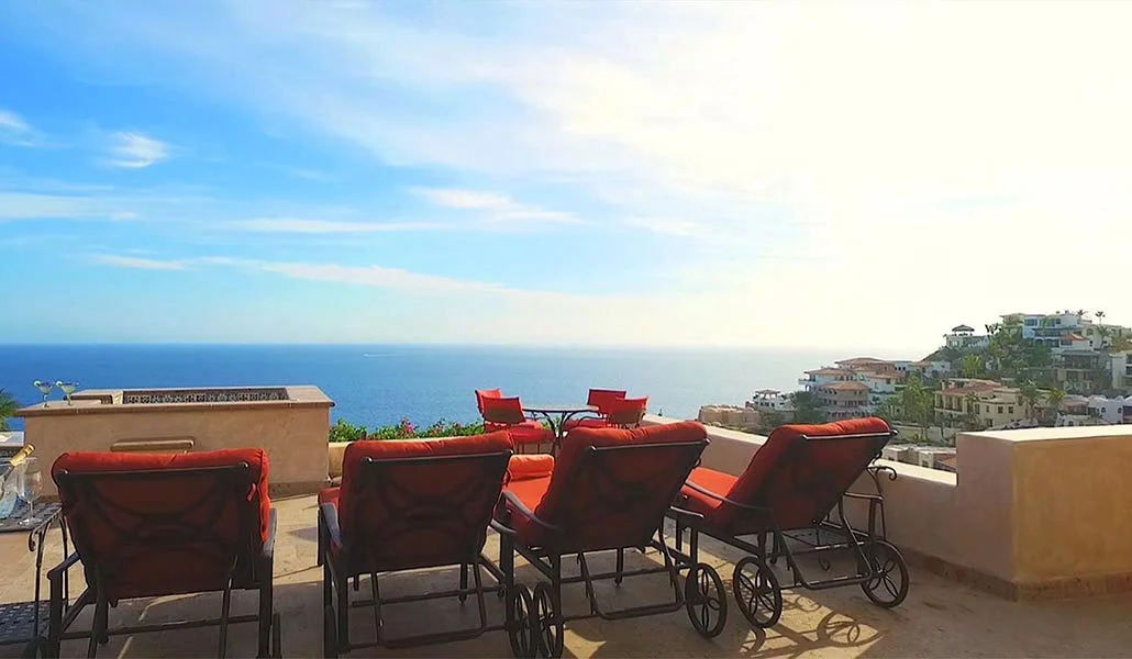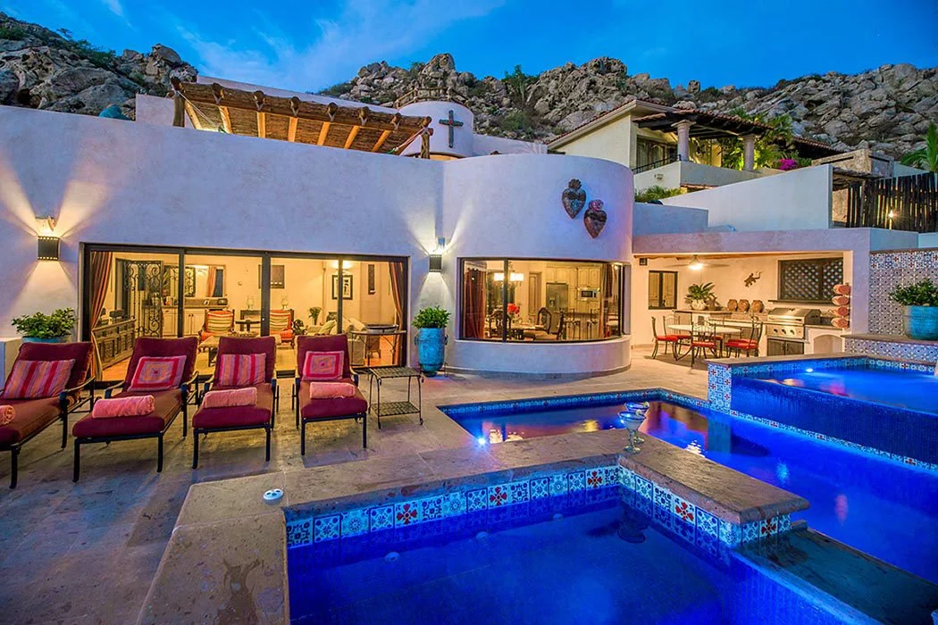 Casa Cascadas is nestled in the hills overlooking the ocean in the exclusive, gated neighborhood of Pedregal. This beautiful custom built home features a breathtaking view of the Pacific Ocean, 4 master suites with private bath and king size beds, patios on multiple levels, a fully equipped kitchen and separate dining area, and a jacuzzi that cascades into a pool. There is a built in gas barbecue on the main terrace along with a great outdoor eating area. The rooftop terrace has a fire pit and a palapa shading a bed that’s great for relaxing, an afternoon siesta or gazing at a star filled sky. The city of Cabo is only a mile away and can be seen from the home’s amazing outdoor spaces.